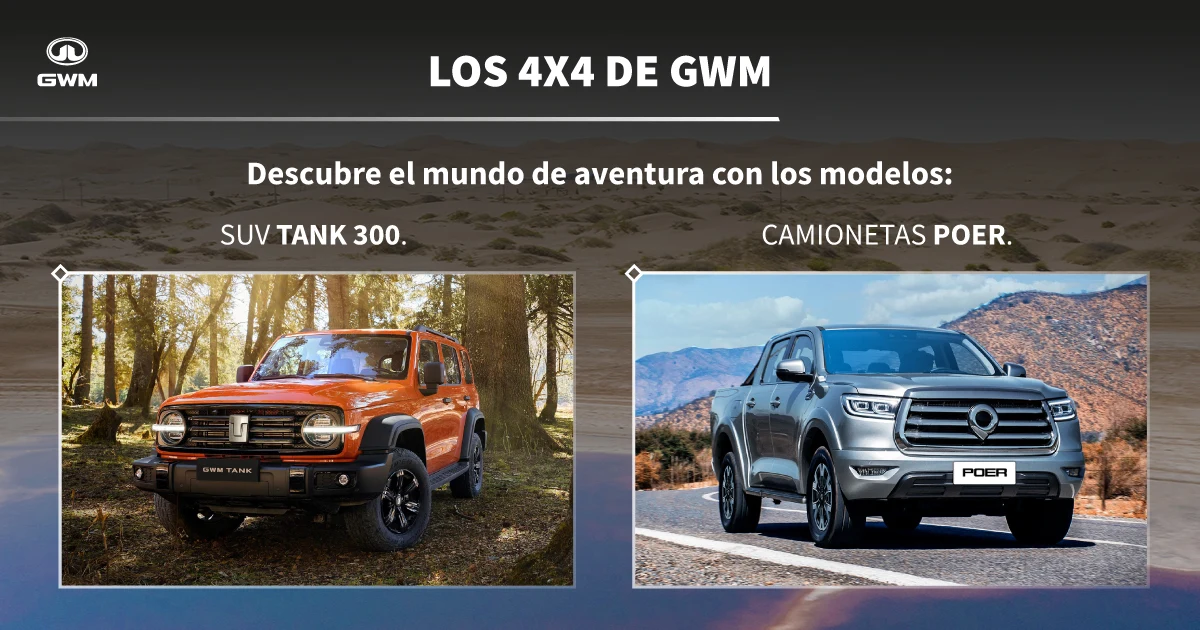 Descubre el mundo de aventura con los modelos SUV Tank 300 y las camionetas Poer 4x4 de GWM, una marca líder en tecnología e innovación.