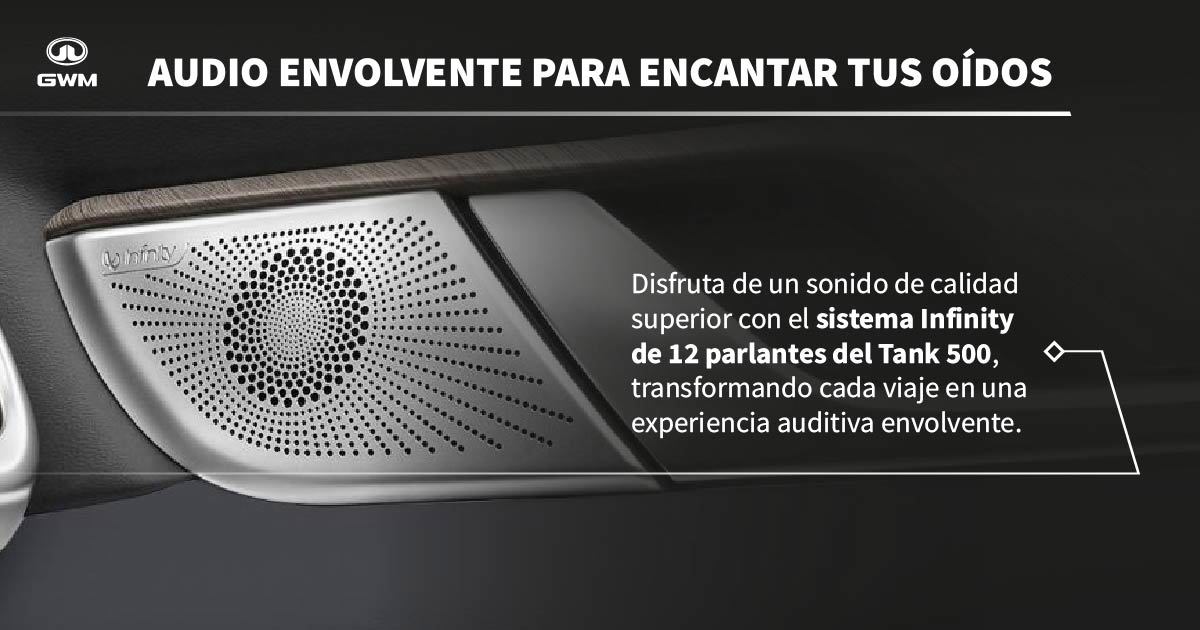 El Tank 500 no decepciona, ya que está equipado con un sistema de sonido Infinity de 12 parlantes que transforma cada viaje en una experiencia auditiva envolvente.
