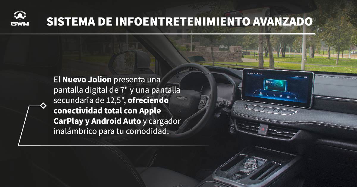 No solo es una joya visual con su interfaz colorida y atractiva, sino que también es tu centro de control inteligente en el camino. Aquí puedes conectar tus dispositivos a través de Bluetooth y disfrutar de Apple CarPlay y Android Auto, teniendo tus aplicaciones favoritas al alcance de tu mano mientras recorres la ruta.